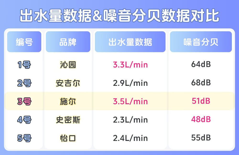 测试数据下来,1号沁园和3号施尔最轻音,2号安吉尔相对高些,但也是在标准之内。
